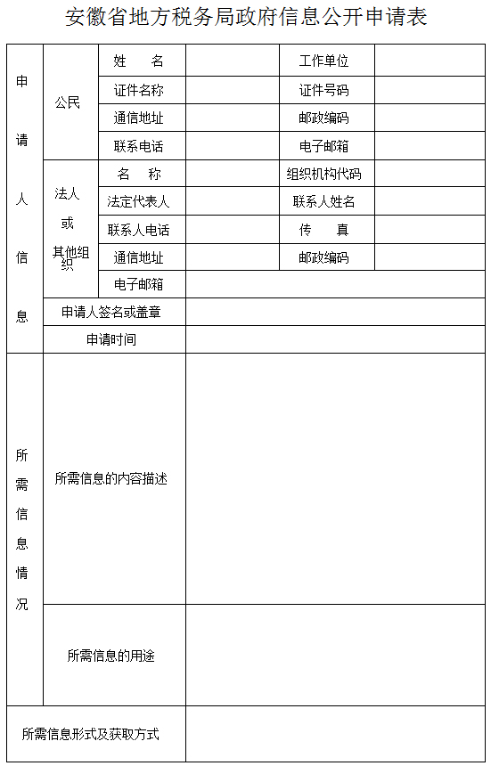 注:申请人可在安徽省地税局政府信息公开网站上填写电子版《申请表》,或通过电子邮件方式发送至安徽省地税务局办公室的电子邮箱(0551bcd@163.com)。