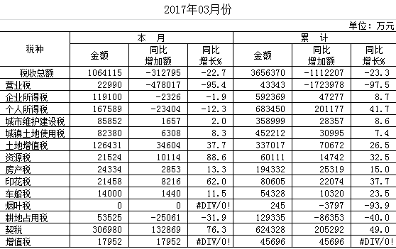 2017年一季度税收收入分税种统计表